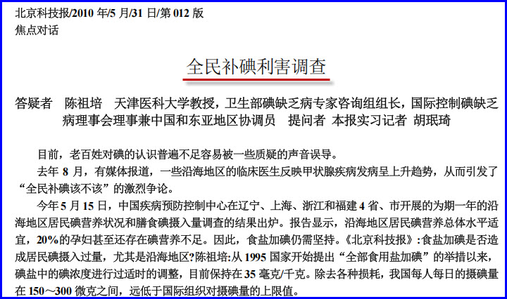 第三节 陈祖培 2010年说:“中国是受碘缺乏严重威胁的国家之一”