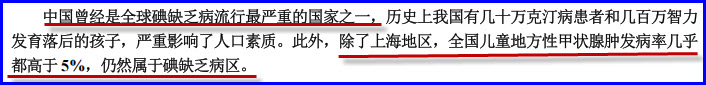 “中国曾经是全球碘缺乏病流行最严重的国家之一,历史上我国有几十万克汀病患者和几百万智力发育落后的孩子,严重影响了人口素质。此外,除了上海地区,全国儿童地方性甲状腺肿发病率几乎都高于 5%,仍然属于碘缺乏病区。”