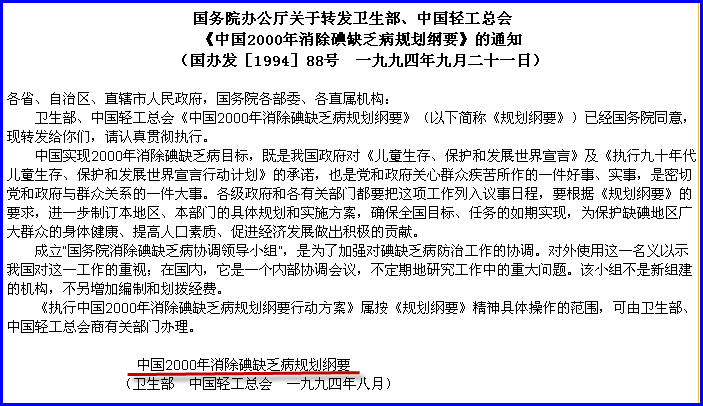 【文件】《中国2000年消除碘缺乏病规划纲要》(国办发[1994]88号 一九九四年九月二十一日)