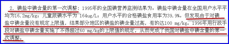 【证据】碘盐中碘含量的第一次调整: 1995年的全国碘营养监测结果为:碘盐中碘含量在全国用户水平平均为16.2mg/kg;儿童尿碘水平为 164ug/L;用户水平的合格碘盐食用率为39.9%。但发现由于对碘盐中碘含量没有规定上限值,结果部分地区的碘盐的碘含量过高,有的达100 mg/kg。1996年用行政手段对碘盐中碘含量实施了不得超过60 mg/kg的上限值的规定,从而完成了我国对碘盐中碘含量的第一次调整。