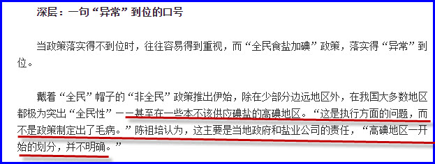 高碘区统统被补碘的事实已经是连卫生部都不得不承认的了,但是陈祖培把责任推给了当地政府和盐业公司。