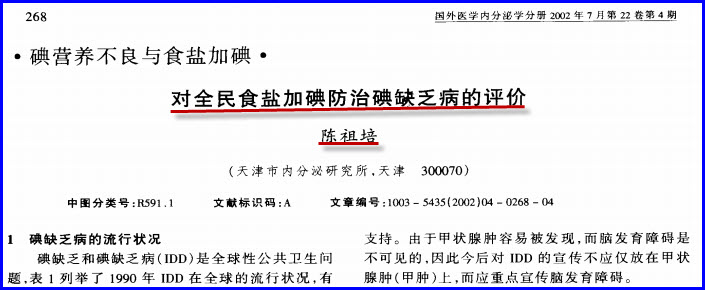 1994年在制定补碘政策时,特意规定高碘区的人们和有甲状腺疾病的人不需要补碘,说明卫生部知道高碘区的人不能再被补碘。国内外在1994年前就有高碘对人类的不利问题的研究和论文出现,陈祖培等人在1994年前在中国地方病杂志上发表过对高碘问题的研究报告,说明陈祖培知道高碘对人民的伤害。