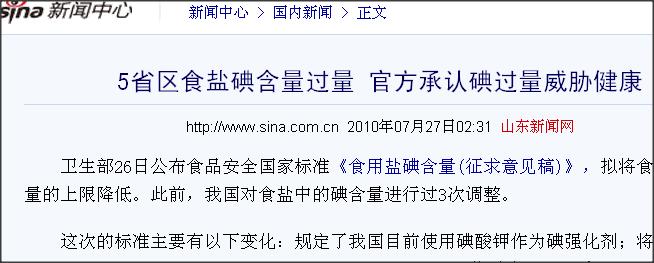 【论文题目】《5省区食盐碘含量过量官方承认碘过量威胁健康》