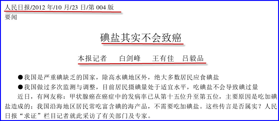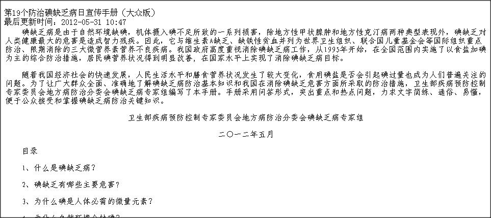 卫生部在所有文件中,所有宣传中都片面强调缺碘的危害,把一个“地方病”忽悠成当前严重危害全国人民健康的头等疾病,把消除碘缺乏病的任务当作中国的头等大事。没有一个文件提到过要预防补碘过量问题。