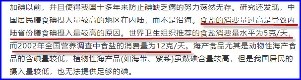 ”中国居民膳食碘摄入量较高的地区在内陆,而不是沿海。食盐的消费量过高是导致内陆省份膳食碘摄入量较高的原因。世界卫生组织推荐的食盐消费量水平为5克/天,而2002年全国营养调查中食盐的消费量为12克/天。海产食品尤其是动物性海产食品的含碘量较低,植物性海产品(如海带、紫菜)虽然碘含量较高,但是我国居民的摄入量较低,也无法提供足够的碘”。