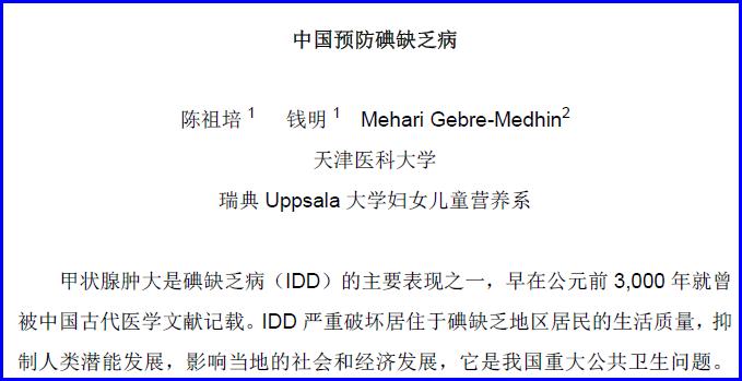 【论文题目】《我国碘缺乏病防治科研进展和当前存在的问题》