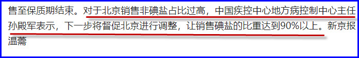 陈祖培说:“这样我国绝大多数的非病区均属于轻度缺碘地区或病区,因此都应供应碘盐”。实际情况是全国被定为缺碘区,所有人都被实行强制全民补碘。