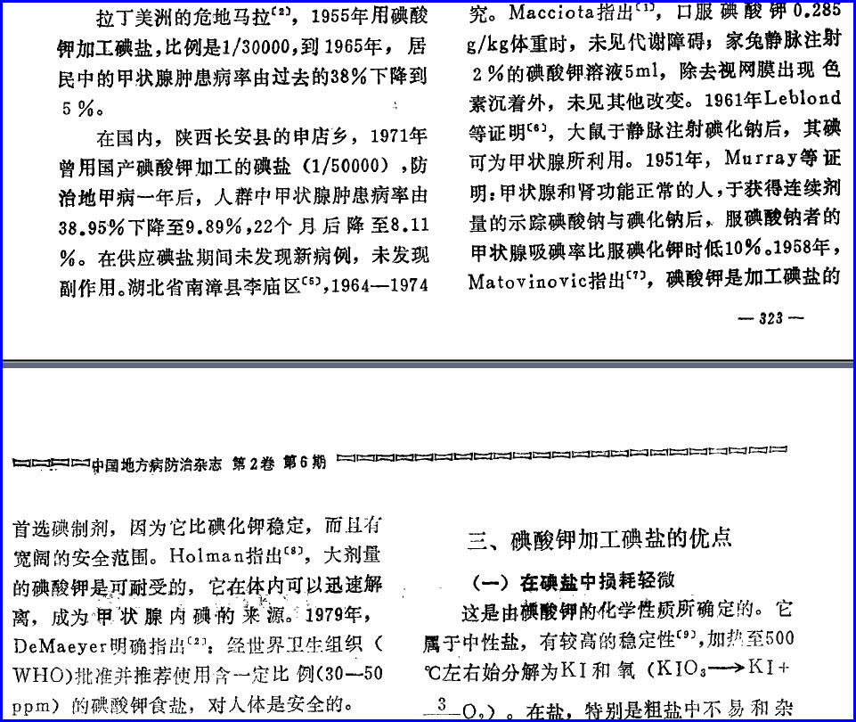 于志恒还举例“国内,陕西长安县的申店乡,1971年曾用国产碘酸钾加工的碘盐(1/50000),防治地甲病一年后,人群中甲状腺肿患病率由38.95%下降至9.89%,22个月L后降至8.11%。在供应碘盐期间未发现新病例,未发现副作用。