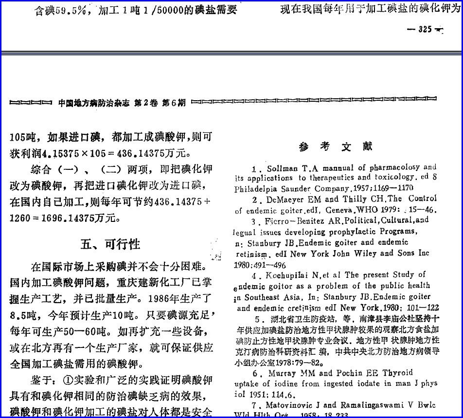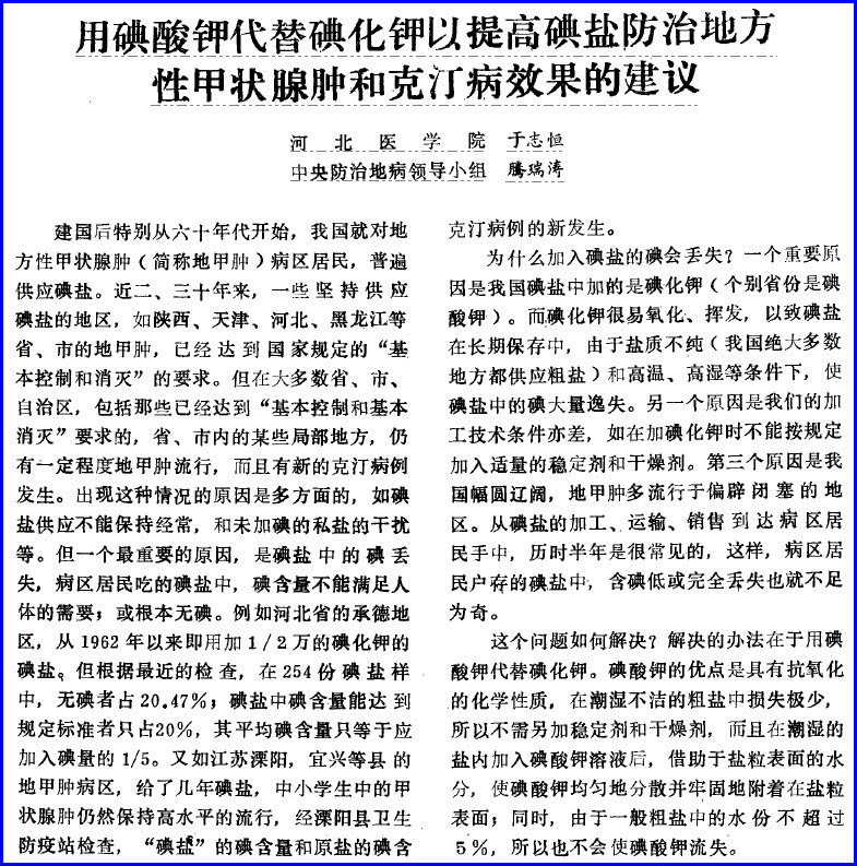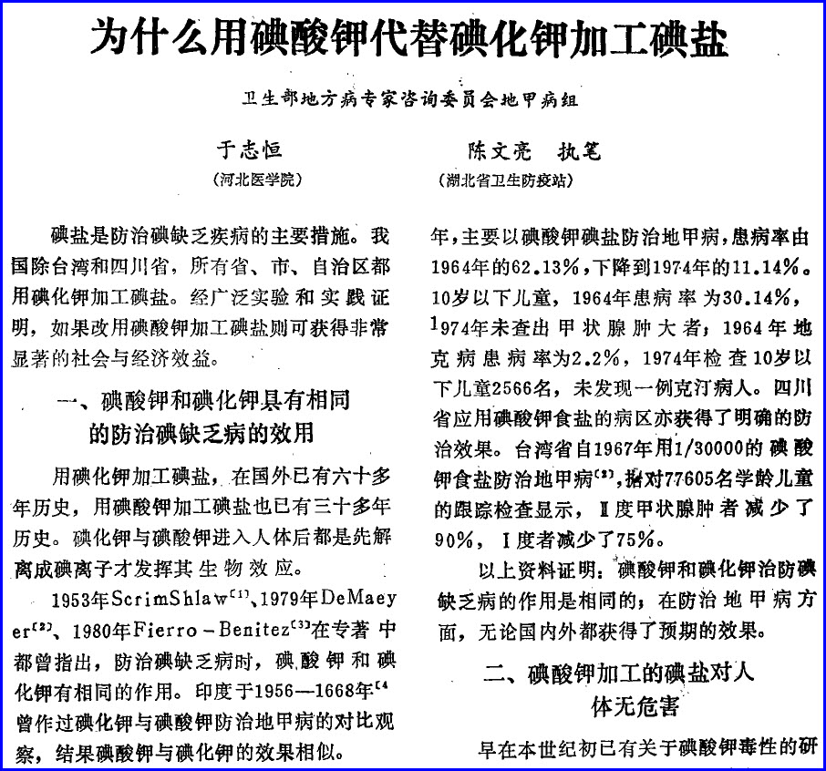 2013年终于找到地方病专家于志恒和中央防治地病领导小组腾瑞涛在《中国地方病杂志》1984年第3卷第3期发表的文章《用碘酸钾代替碘化钾以提高碘盐防治地方性甲状腺肿和克汀病效果的建议》,(简称《建议》),还找到了地方病专家于志恒(河北医学院)陈文亮执笔(湖北省卫生防疫站)发表在《中国地方病防治杂志》1987年第2卷第6期的文章《为什么用碘酸钾代替碘化钾加工碘盐》,(简称《为什么》),拜读了这两篇当时涉及3.1亿人,现在涉及14亿人健康的极其重要的论文,特别是发现以“卫生部地方病专家咨询委员会地甲病组”名义发表的《为什么用碘酸钾代替碘化钾加工碘盐》里充满了巨大错误,巨大欺骗。但是这样的报告还能被批准,说明了卫生部官员是糊涂透顶,还是有意为之?也说明谎话说千遍也会变成真理。这样的论文也能发表,说明了《中国地方病防治杂志》低级到了什么水平!