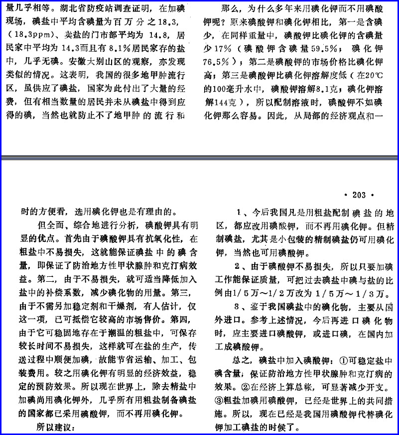 这篇文章的错误,不是普通的错误,因为它涉及到当时3.1亿人,现在全中国14亿人的健康的大事,因此错误是巨大的。如果不全文公布“建议”原文,没有人相信“卫生部地方病专家咨询委员会地甲病组”,为了把碘化钾补碘改为碘酸钾补碘,会如此猖狂,如此随心所欲,如此公开欺骗。因此在这里全文以图片格式发表,说明我没改动一个文字,供人们欣赏这两篇罪恶的论文。