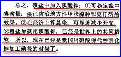 【证据】“总之,碘盐中加入碘酸钾:①可稳定盐中碘含量;保证防治地方性甲状腺肿和克汀病的效果。②在经济上算总帐,可显著减少开支。③粗盐加碘用碘酸钾,已经是世界上的共同措施。所以,现在已经是我国用碘酸钾代替碘化钾加工碘盐的时候了”。