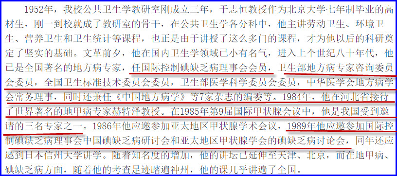 “进入上个世纪八十年代,他已是全国著名的地方病专家,任国际控制碘缺乏病理事会会员,卫生部地方病专家咨询委员会委员,全国卫生标准技术委员会委员,卫生部医学科学委员会委员,中华医学会地方病学会常务理事,同时还兼任《中国地方病学》等7家杂志的编委等。1984年,他在河北省接待了世界著名的地甲病专家赫特泽教授。在1985年第9届国际甲状腺会议中,他是我国受到邀请的三名专家之一”