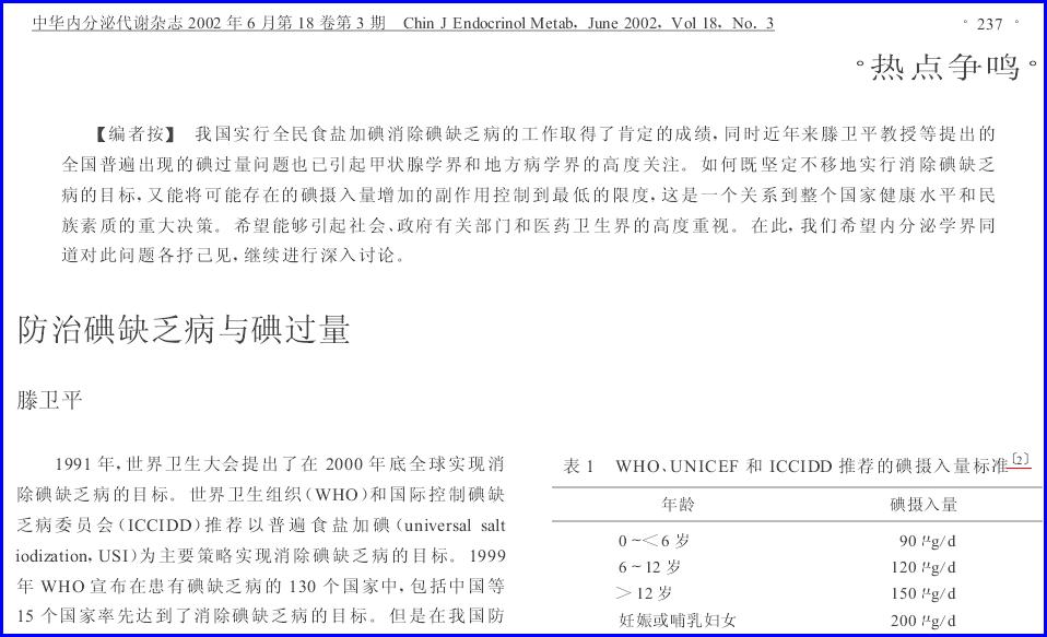 我们认为:WHO和ICCIDD提出的“每天1 000μg的碘摄入量对健康成年人是安全的”是一个概念模糊的声明。因为这里“健康”人群的概念是难以界定的。内分泌科临床医生都知道:在普通人群中潜藏着一个具有甲状腺疾病发病倾向的庞大易感群体。我们在普查发现女性普通人群中的12.98%甲状腺过氧化物酶抗体(TPOAb)阳性,11.22%甲状腺球蛋白抗体(TGAb)阳性〔16〕。具有甲状腺疾病家族史者的也占普通人群的10%以上。不依赖医生的检查,这个庞大的易感人群是无法从“健康人群”中区分出来的,而碘摄入量危害最大的恰恰是这个易感人群。随着全民食盐加碘在全世界各国实施后出现的甲状腺疾病发病率的急剧增加,,WHO和ICCIDD的观点也发生了转变。2001年,WHO和ICCIDD首次把尿碘超过300μg/ L定义为碘过量。并且提出不应当鼓励碘摄入量超过MUI 300μg/ L。”
