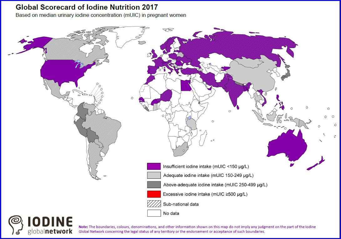 全世界只有中国达不到孕妇的碘营养标准吗?不是,2017年国际控制碘缺乏病联盟发表全世界孕妇碘营养状态。