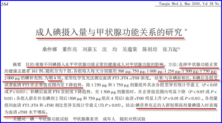 【说明】上述论文作者全部是医学专家,明知碘酸钾是比碘化钾毒性大很多的药品,明知中国用碘酸钾补碘,为什么要“挂羊头卖狗肉“呢?用碘化钾的实验结果代替碘酸钾的结果呢?就是要掩盖碘酸钾对中国人的伤害