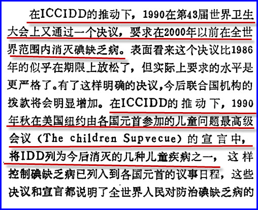 “在ICCIDD的推动下,1990年在第43届世界卫生大会上又通过一个决议,要求在2000年以前在全世界范围内消灭碘缺乏病。表面看来这个决议比1986年的似乎在期限上放松了,但实际上要求的水平是更严格了。有了这样明确的决议,今后联合国机构的拨款将会明显增加。