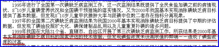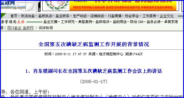 肖东楼副司长在全国第五次碘缺乏病监测工作会议上的讲话说(2005-01-17): “1999年我国在大陆31个省、直辖市、自治区开展了第三次碘缺乏病监测工作,所获结果是2000年基本实现消除碘缺乏病目标的国家评估的技术依据,但发现碘盐浓度未设高限值的弊端--造成了碘盐浓度的过高。”