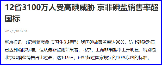 【论文题目】《12省3100万人受高碘威胁 京非碘盐销售率超国标》