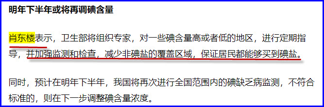 “据介绍,此前我国对碘盐的要求是全国统一标准,今年3月起则因地制宜,各省在国家规定的范围内,自行设定碘盐标准。缘何有此要求?肖东楼表示,根据各地水土环境不同,居民当前的含碘水平并不一致”