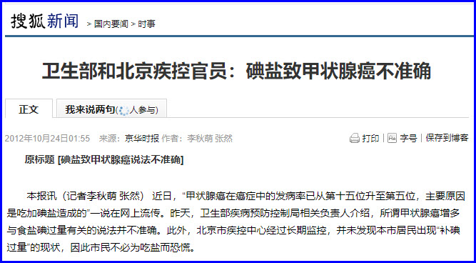 【论文题目】《卫生部和北京疾控官员:碘盐致甲状腺癌不准确》