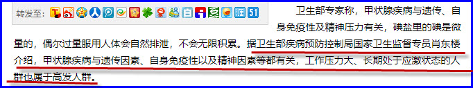“卫生部专家称,甲状腺疾病与遗传、自身免疫性及精神压力有关,碘盐里的碘是微量的,偶尔过量服用人体会自然排泄,不会无限积累。据卫生部疾病预防控制局国家卫生监督专员肖东楼介绍,甲状腺疾病与遗传因素、自身免疫性以及精神因素等都有关,工作压力大、长期处于应激状态的人群也属于高发人群。”