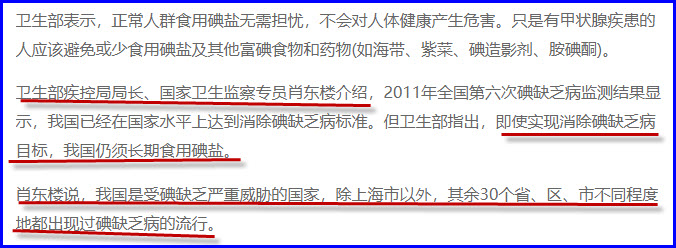 我国的强制全民补碘是全国统一一个标准大剂量补碘,肯定是会出现过量现象,特别是沿海地区,会明显过量。但是肖东楼却说“绝大多数地区居民的碘营养状况处于适宜和安全水平,沿海地区也不例外”,是明显错误的。