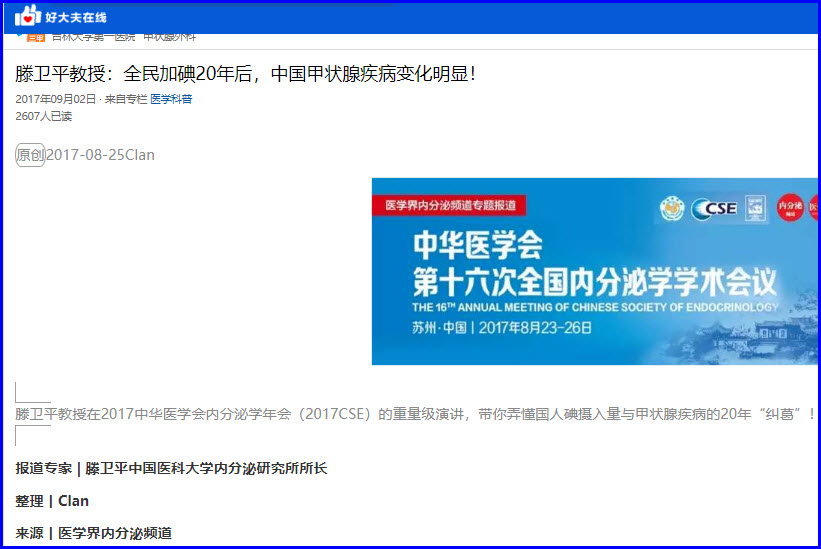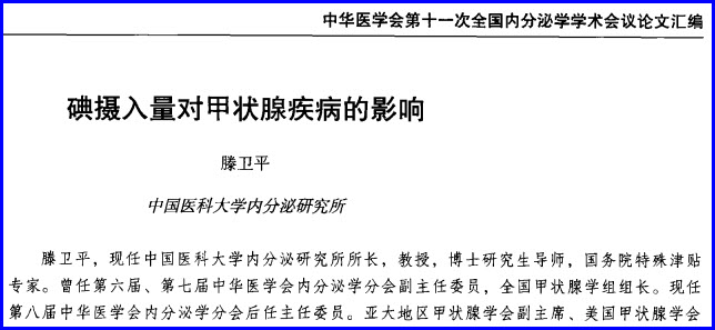 【论文题目】《滕卫平教授:全民加碘20年后,中国甲状腺疾病变化明显!》