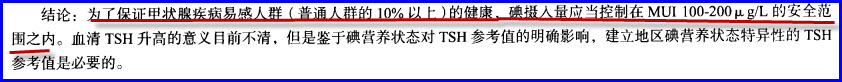 “为了保证甲状腺疾病易感人群(普通人群的10%以上)的健康, 碘摄入量应当控制在MUI100-200μg/L的安全范围之内”。