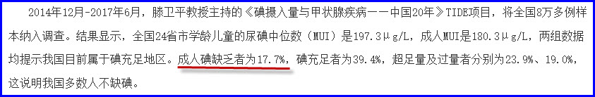 文章没说这17.7%的缺碘人群数据从何而来,但是文章承认“根据2015年的全国居民碘营养监测,我国的碘盐覆盖率达98.0%,合格碘盐覆盖率达95.3%”,因此全国最多碘缺乏者不过5%,不可能是17.7%。经过长达20年的高强度大剂量强制全民补碘,还有17.7%的中国人缺碘,可能吗?