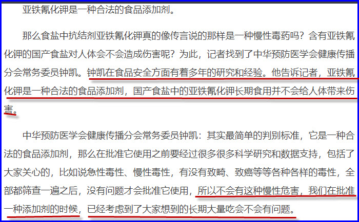 但是钟凯为了极力推行强制全民添加亚铁氰化钾,对有关亚铁氰化钾的危害从来就是只字不提。