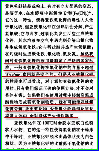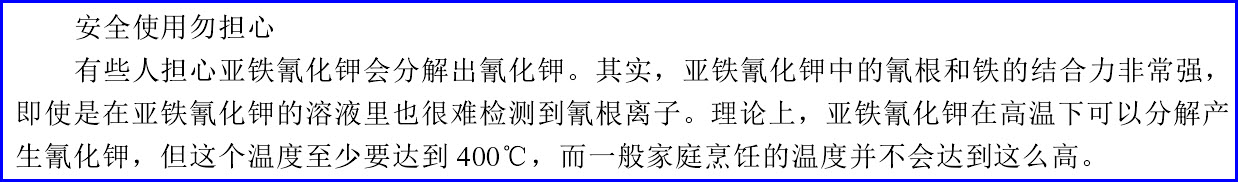 “如果我们在使用过程中接触高温或酸性物质或强氧化剂物质, 就有可能使亚铁氰化钾分解, 放出氰化物, 少量氰化物经消化道长期进入体内, 会对身体产生慢性毒害”。
