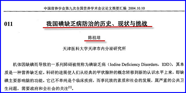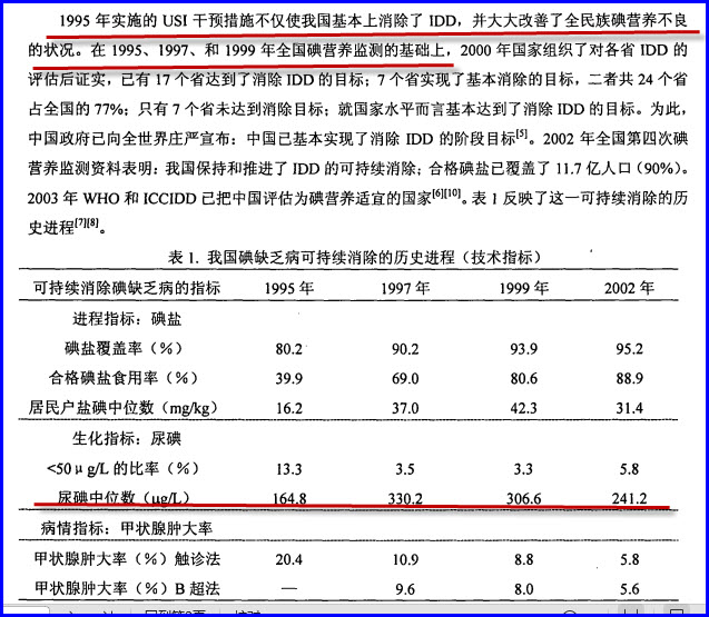 上面是数据证明我国儿童尿碘在1995年是在理想范畴,1996年到2001年是在过量范畴。2002年后是在超过足够的范畴。陈祖培在这里只谈消除碘缺乏病的成绩,根本不提补碘过量问题,更不谈补碘过量的危害。