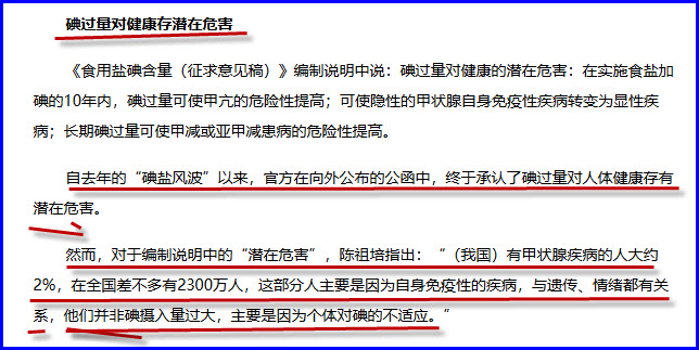 然而,对于编制说明中的“潜在危害”,陈祖培指出:“(我国)有甲状腺疾病的人大约2%,在全国差不多有2300万人,这部分人主要是因为自身免疫性的疾病,与遗传、情绪都有关系,他们并非碘摄入量过大,主要是因为个体对碘的不适应。”