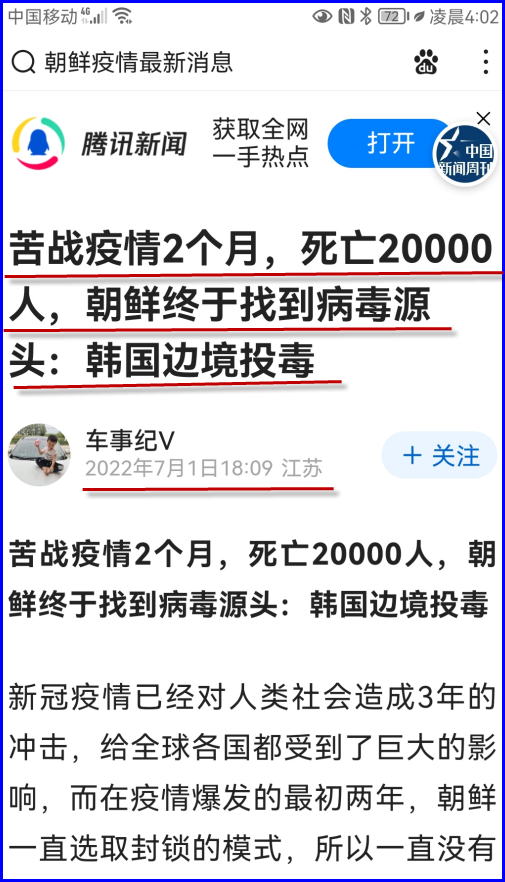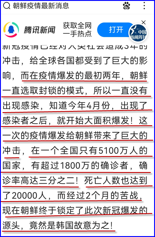 2022年7月1日腾讯网站发表文章造谣说朝鲜人口5100万,朝鲜疫情死亡2万人。这全部都是南韩的数据,被特意说成是朝鲜的数据。