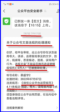本人发现后于7月2日发表文章辟谣。但辟谣的文章于7月7日被删除,造谣的文章至今仍然存在。从此之后我再没发表任何文章,但仍然于9月15日被“永久封禁”。