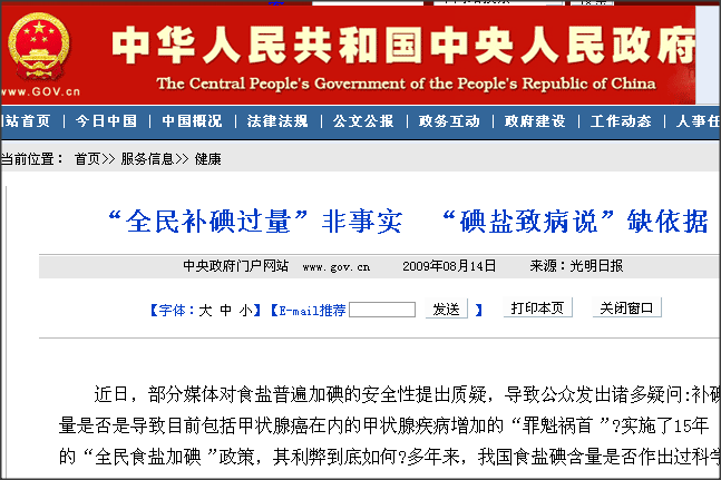 【文章题目】《“全民补碘过量”非事实 “碘盐致病说”缺依据》