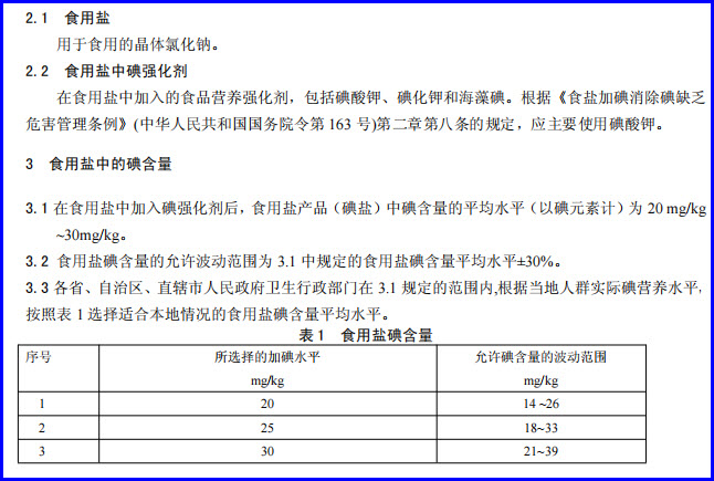 “3.1 在食用盐中加入碘强化剂后,食用盐产品(碘盐)中碘含量的平均水平(以碘元素计)为 20 mg/kg ~30mg/kg。