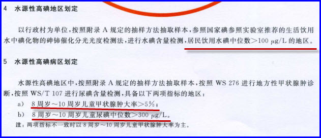 凡一个地区(以乡、镇为单位),未采取补碘或改水措施,具备以下两项指标即可定为高碘地区。..