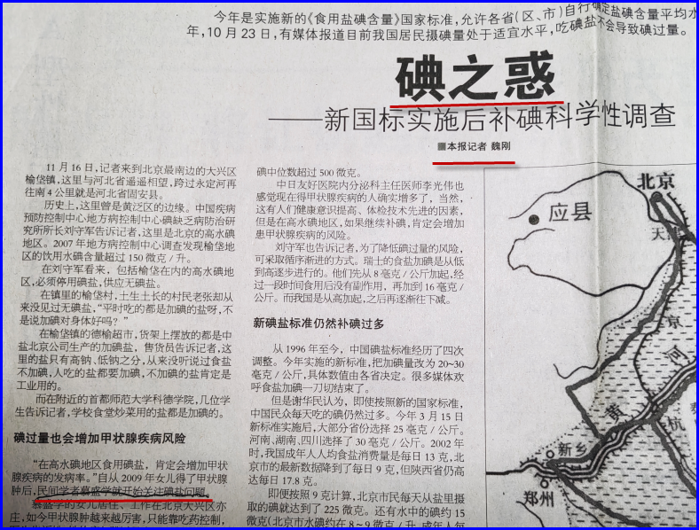 《中国科学报》的这篇文章是报社记者魏刚于2012年11月16日到我家采访,并共同去大兴区榆垡镇采访。记者又采访了谢华民之后发表的长篇调查报告。作为中国的大报,《中国科学报》能公开质疑强制全民补碘的科学性,是十分难能可贵的。