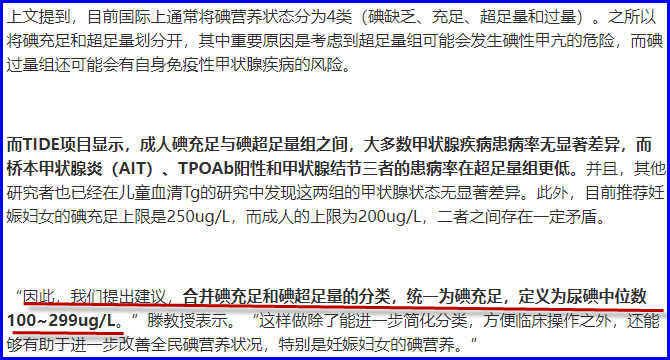 “我们提出建议,合井碘充足和碘超足量的分类,统一为碘充足,定义为尿碘中位数100~299ug/L“。滕教授表示。