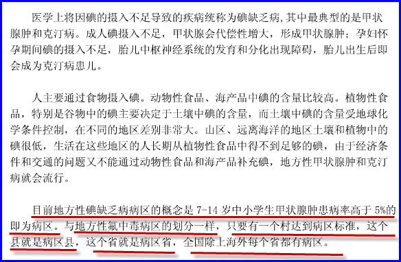 “目前地方性碘缺乏病病区的概念是7-14岁中小学生甲状腺肿患病率高于5%的即为病区。与地方性氟中毒病区的划分一样,只要有一个村达到病区标准,这个县就是病区县,这个省就是病区省,全国除上海外每个省都有病区。”