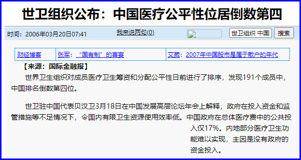 2006年世界卫生组织对成员医疗卫生筹资和分配公平性日前进行了排序,发现191个成员中,中国排名倒数第四位。