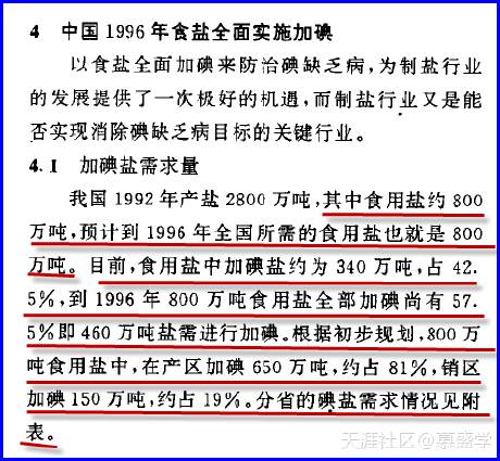3、“到1996年800万吨食用盐(包括食品工业用盐和畜牧用盐)将实施全部加碘。”