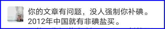 全世界几乎公认中国的补碘是强制性的,但国内有些人不同意,说我是造谣,例如下面这个人的留言: