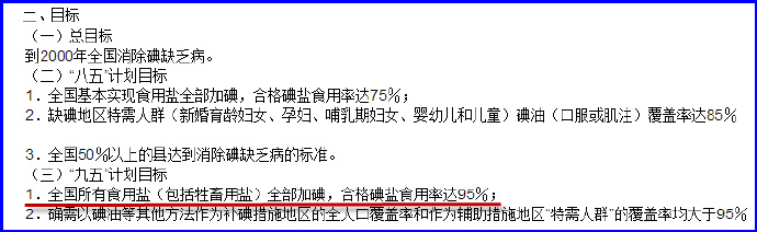 【说明】这个规划纲要是美国人与中国盐业总公司共同制定的,文件规定“全国所有食盐(包括牲畜用盐)全部加碘”,这一句话就表明了中国推行的补碘是强制性的。