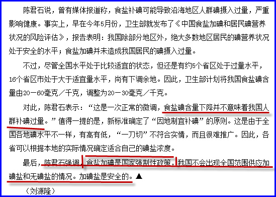 我国明明推行的是强制全民补碘,却因为“强制”这个词不太雅观,一直不敢公开承认,这位“yahoo”的人说“你的文章有问题,没有人强制你补碘,2012年中国就有非碘盐买”,从他这句话看出他承认2012年前是强制,2012年后不强制了。