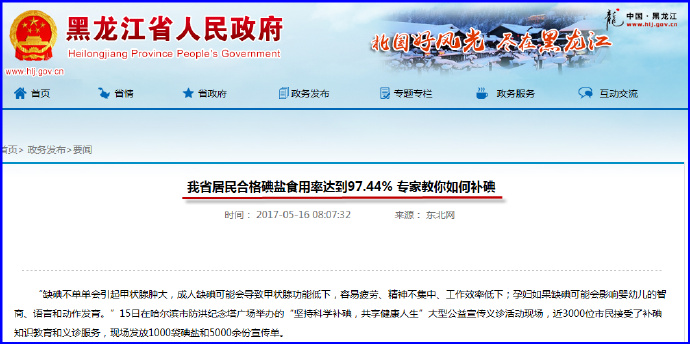 黑龙江省退休工资发放困难,需要国家补贴,但在推行强制全民补碘方面却毫不含糊,走在北京、上海的前头。黑龙江省政府公布居民合格碘盐食用率达到97`.44%,这是一个很高的数字,这个数字不是普及率,不是覆盖率,而是真真切切的食用率,远高于北京和上海。这个数字不可能是100%,剩余 2.56%是富豪、高官和有甲状腺疾病不让吃碘盐的患者。