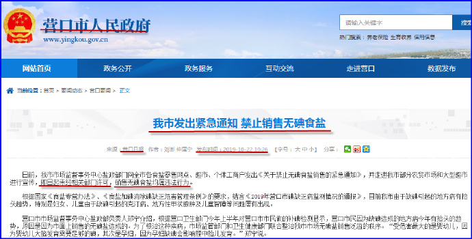 7、营口市人民政府2019年10月22日发出紧急通知禁止销售无碘食盐