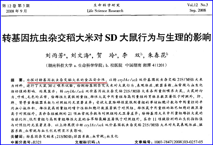 退一万步说,即使30天的实验一点没有问题,30天没问题就能证明长期食用没问题吗?因为30天实验安全就批准中国人可以长期食用转基因大米,这是对人民健康的负责吗?