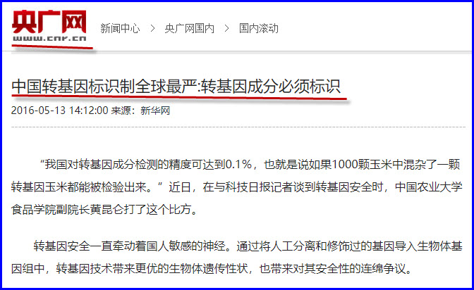【文章题目】《中国转基因标识制全球最严:转基因成分必须标识》
